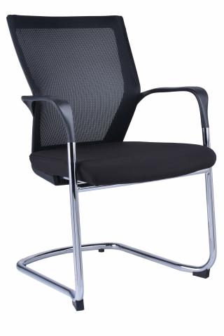 Commercial grade visitor chair with arms, cantilever chrome frame, black seat fabric & black mesh back, 5 year warranty