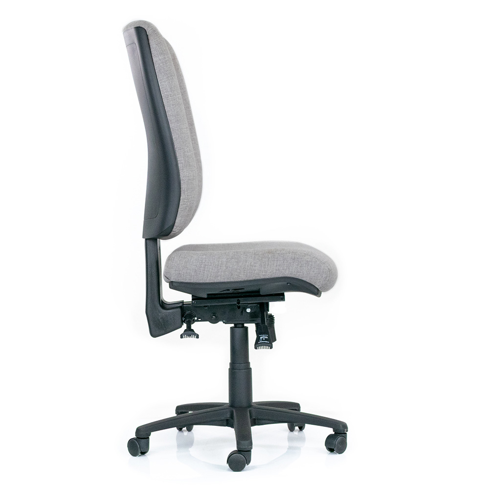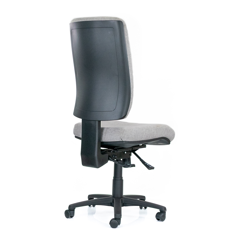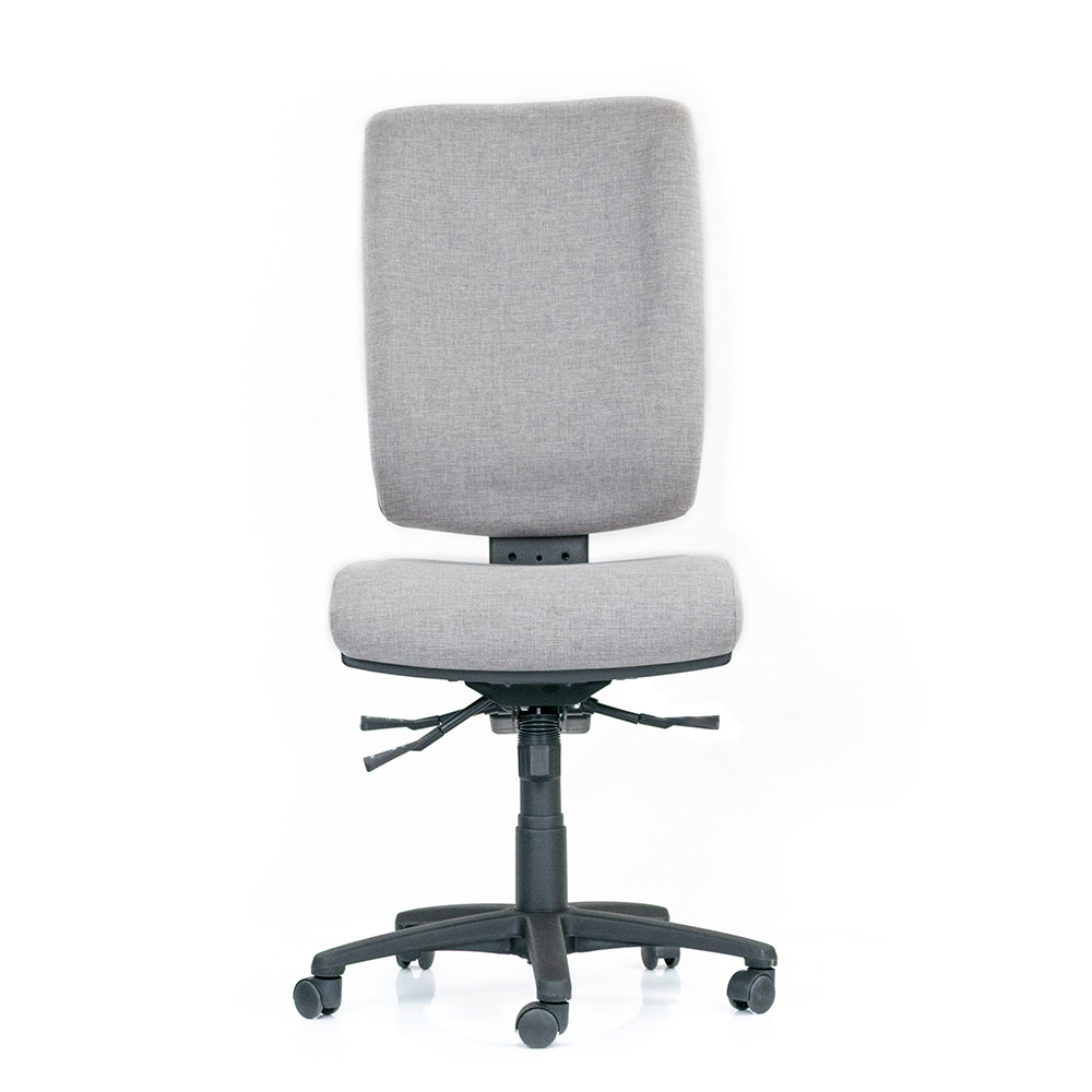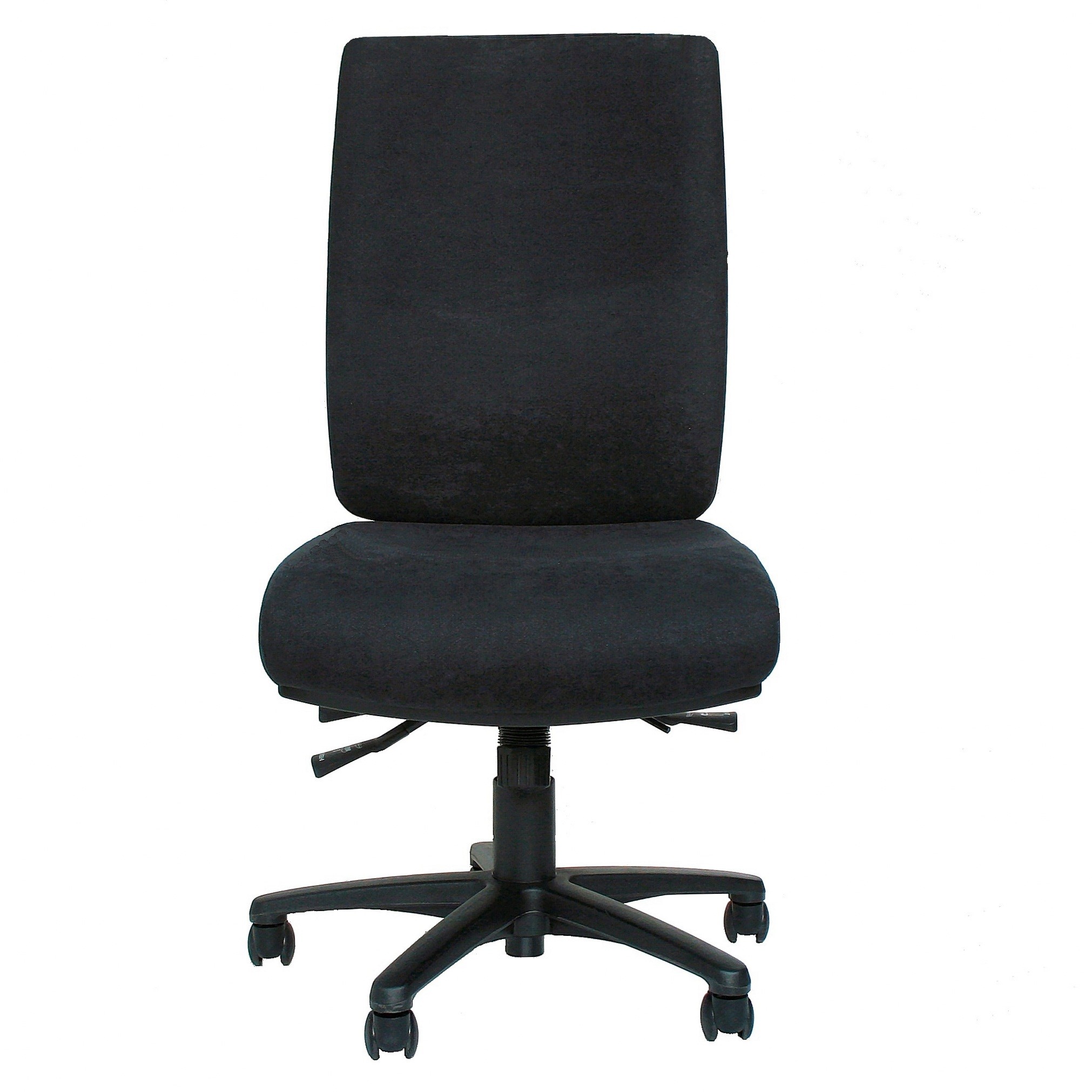 Custom fully ergonomic office chair. Features extra-large back, heavy duty fully ergonomic 3 lever mechanism, ratchet or hand wheel back adjustment, 50mm moulded flexible polyurethane seat with a 25mm soft overlay. Reinforced black nylon base.